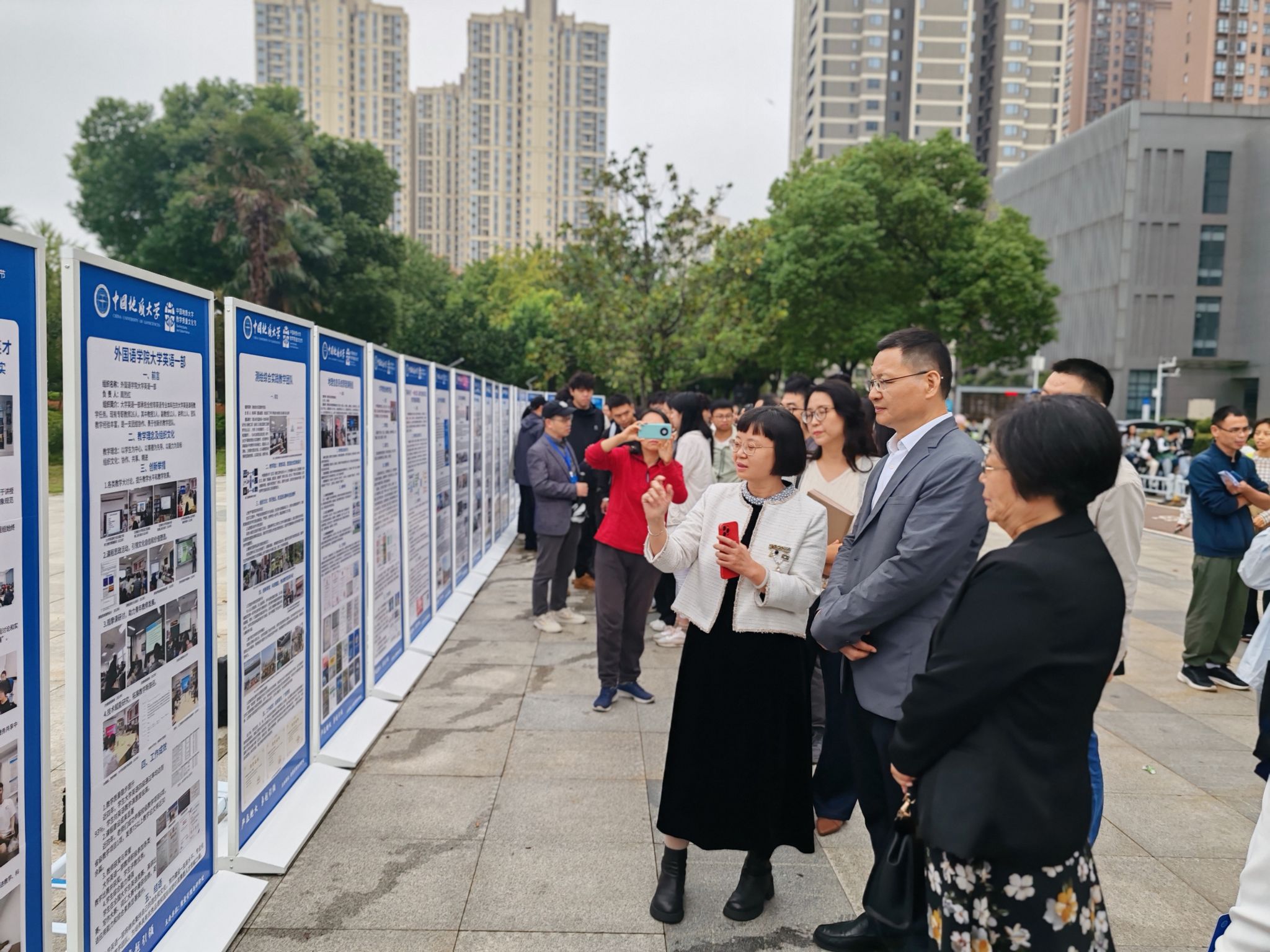展区,认真听取团队成员介绍,细致审阅展示材料,并围绕外语教学中的课程思政融入、跨文化交际能力培养等关键内容进行深入了解,还结合学院学科特色与发展实际,针对专业核心课程体系建设、教学质量精细化把控与团队成员展开讨论并给予精准指导。